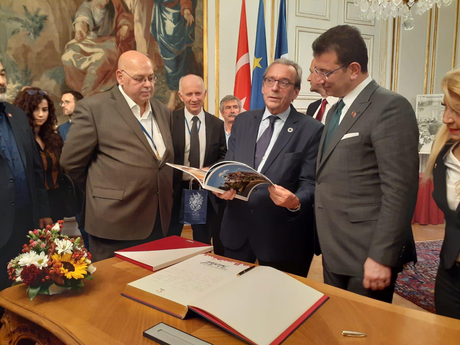 İmamoğlu, kongredeki konuşmasının ardından Strasburg Belediye Başkanı Roland Ries’i makamında ziyaret etti. İzmir Büyükşehir Belediye Başkanı Tunç Soyer, Büyükçekmece Belediye Başkanı Hasan Akgün ve Bakırköy Belediye Başkanı Bülent Kerimoğlu da ziyarette yer aldı. Başkanların ziyaretinden duyduğu memnuniyeti dile getiren Ries, “Bizim de dikkat ettiğimiz, Türkiye ve Fransa ya da AB arasındaki ilişkilerin karışık durumuna rağmen, Türk ve Fransız yerel ve bölgesel yönetimleri, daha geniş bir çerçevede Avrupa’da, sivil toplumları ve özellikle gençleri arasında zengin ve yapıcı bir diyaloğun sürdürülmesi adına ilişkilerini güçlendirmelidir. Bu bağlamda, beraber geleceğe dönük bir yatırım yaptığımız için İBB Başkanı sayın İmamoğlu’nu ağırlamaktan büyük bir memnuniyet duyuyorum” dedi. İmamoğlu da Ries’in sözlerine, “Türkiye’nin ve Avrupa’nın en büyük kenti olan ve ülkemizin kültür, sanat ve ekonomik merkezi pozisyonundaki İstanbul’un Avrupa’nın başkenti Strasburg kenti ile, dostluk temelli ve sürdürülebilir ilişkiler kurması, Türkiye, Fransa ve AB için son derece değerlidir. Bu maksatla sayın Başkan Roland Ries’in davetiyle burada olmaktan büyük memnuniyet duydum” şeklinde karşılık verdi. Makam odasından belediye binasındaki salona geçen başkanlar, çoğunluğu Strasburg’da yaşayan Türk vatandaşlarından oluşan bir toplulukla bir araya geldi. İmamoğlu ve Ries, burada da birer konuşma yaptı. İmamoğlu, konuşmaların ardından “Şehir Şeref Defteri’nin adı, İstanbul silueti ve Türk bayrağı baskılı olan sayfasına duygularını yazdı.