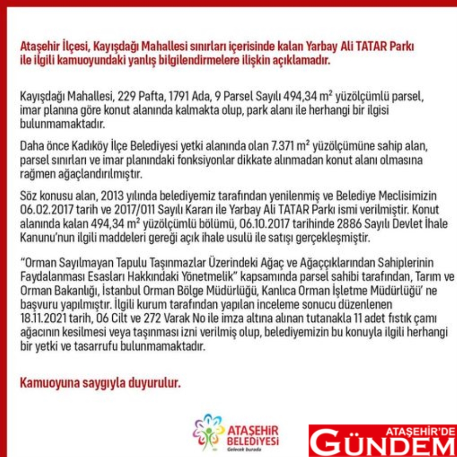 "Ataşehir Kayışdağı Mahallesi sınırları içerisinde kalan Yarbay Ali TATAR Parkı ile ilgili kamuoyundaki ilişkin açıklamadır. Kayışdağı Mahallesi, 229 Pafta, 1791 Ada, 9 parsel sayılı 494,34 parsel, imar planına göre konut alanında kalmakta olup, park alanı ile herhangi bir ilgisi bulunmamaktadır. Daha önce Kadıköy İlçe Belediyesi yetki alanında olan 7.371 m2 yüzölçümüne sahip alan parsel sınırları ve imar planındaki fonksiyonlar dikkate alınmadan konut alam olmasına rağmen ağaçlandırılmıştır. Söz konusu alan, 2013 yılında belediyemiz tarafından ve Belediye Meclisimizin 06.02.2017 tarih ve 2017/011 Saylı Karan ile Yarbay Ali TATAR parka ismi verilmiştir. Konut alanında kalan 494,34 06.102017 tarihinde 2886 sayılı Devlet ihale Kanunu'nun ilgili maddeleri gereği açık ihale usulü ile satışı gerçekleşmiştir. "Orman Sayılmayan Tapulu Taşınmazlar Üzerindeki Ağaç ve Ağaççıkların Sahiplerinin Faydalanması Esasları Hakkındaki Yönetmelik” kapsamında parsel sahibi tarafından, Tarım ve Orman Bakanlığı, İstanbul Orman Bölge Müdürlüğü Kanlıca Orman İşletme Müdürlüğü’ ne başvuru yapılmıştır. İlgili kurum tarafından yapılan inceleme sonucu düzenlenen 18.11.2021 tarif 06. Cilt ve 272 Varak No ile imza altına alınan tutanakla 11 adet fıstık çamı ağacının kesilmesi veya taşınmasına izni verilmiş olup, belediyemizin bu konuyla ilgili herhangi bir yetki ve tasarrufu bulunmamaktadır.”