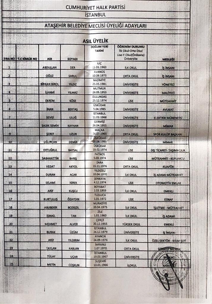 CHP İstanbul Ataşehir Belediye Meclis Üyeliği Aday Listesi şu şekilde sıralanıyor: