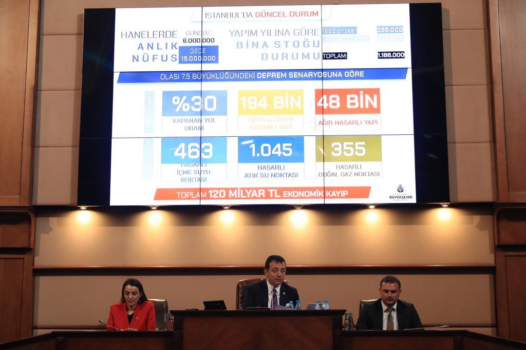 İstanbul’un gece konut nüfusunun 15 milyon, gündüz nüfusunun ise 6 milyon olduğunu belirten İmamoğlu, kentteki toplam 1 milyon 166 bin binanın 255 bininin 1980 öncesinde, 533 binin 1990-2000, 376 bininin de 2000-2019 yılları arasında inşa edildiğini kaydetti. İmamoğlu, İBB Deprem ve Zemin İnceleme Müdürlüğü ve Boğaziçi Üniversitesi tarafından 2018 yılında gerçekleştirilen “Deprem ve Hasar Kayıp Tahmin Çalışmasına” göre; İstanbul’da olası gerçekleşecek 7,5 büyüklüğündeki yıkıcı deprem senaryosu uyarınca ekonomik, fiziksel kayıp ve hasarları da sıraladı. 7.5 büyüklüğündeki yıkıcı bir deprem senaryosuna göre; İstanbul’da çok ağır ve ağır hasarlı bina sayısı 48 bin, orta ve daha üstü hasarlı bina sayısı 194 bin olacak. Bu rakamlara göre; binaların yüzde 22,6’sı yıkılacak, 25 milyon ton enkaz oluşacak, yolların yüzde 30’u kapanacak, 463 içme suyu noktası, bin 45 atık su noktası ve 355 doğal gaz noktası hasar görecek. Toplamda 120 milyar TL yapısal ve yapısal olmayan ekonomik kayıp yaşanacak.