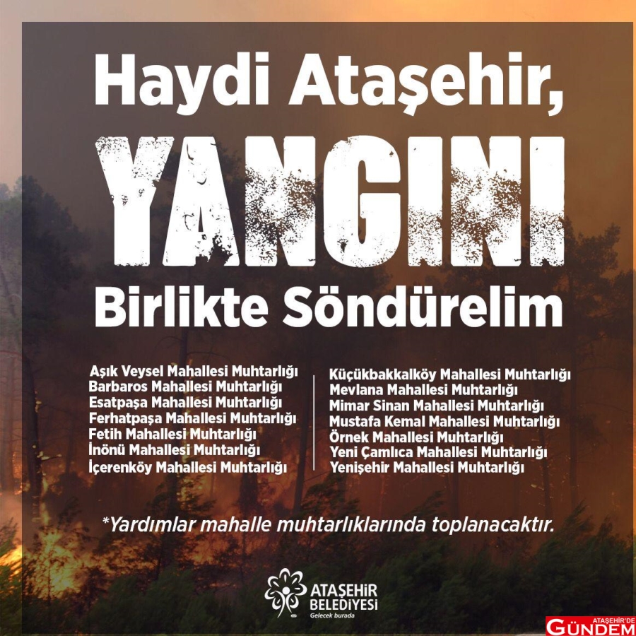 Türkiye’de çıkan yangınlar için yardım kampanyaları devam ediyor.  Çeşitli il ve ilçelerden Ege ve Akdeniz’e gönderilen yardımlara bir destek de Ataşehir muhtarlarından geldi. Aşık Veysel Muhtarlığı, Barbaros Mahallesi Muhtarlığı, Esatpaşa Mahallesi Muhtarlığı, Ferhatpaşa Mahallesi Muhtarlığı, Fetih Mahallesi Muhtarlığı, İnönü Mahallesi Muhtarlığı, İçerenköy Mahallesi Muhtarlığı, Küçükbakkalköy Mahallesi Muhtarlığı, Mevlana Mahallesi Muhtarlığı, Mimar Sinan Mahallesi Muhtarlığı, Örnek Mahallesi Muhtarlığı, Yeni Çamlıca Mahallesi Muhtarlığı, Yenişehir Mahallesi Muhtarlığı olarak kampanya başlatan muhtarlar, sosyal medyalarından çağrıda bulunarak ihtiyaç listesi belirlediler. 10 Ağustos gününe kadar toplanacak yardımlar, Ataşehir Belediyesi aracılığıyla Manavgat’a ulaştırılacak.