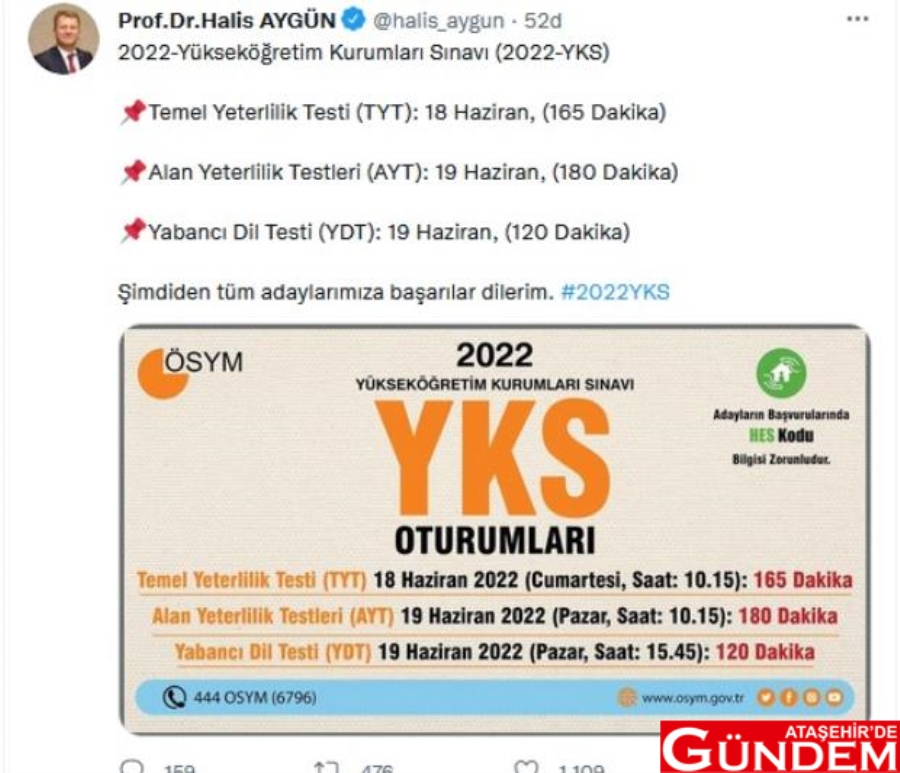 Üniversiteye girmek için en önemli adımlardan biri olan 2022 YKS kılavuzu ÖSYM tarafından yayınladı. ÖSYM Başkanı Halis Aygün sosyal paylaşım sitesi Twitter hesabından yaptığı paylaşımda, "Değerli adaylarımız, 18-19 Haziran 2022 tarihlerinde gerçekleştireceğimiz Yükseköğretim Kurumları Sınavı (2022-YKS) başvuru klavuzu osym.gov.tr sitemizde yayımlanmıştır. Başvurularınızı 11 Şubat-7 Mart 2022 tarihleri arasında yapabilirsiniz" ifadelerini kullandı.