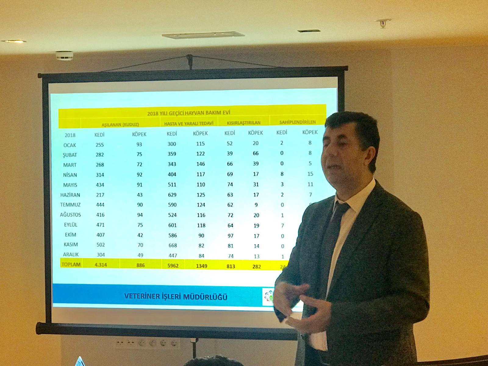 Ataşehir Belediyesi Başkan Yardımcısı Orhan Çerkez'den sonra söz olan Ataşehir Belediyesi Veteriner İşleri Müdürü Necati Bozkurt : " Öncelikle geldiğiniz için çok teşekkür ediyor, sizlere , Sayın Belediye Başkanımız Battal İlgezdi önderliğinde Veteriner İşleri Müdürlüğü olarak şimdiye kadar neler yaptığımızı paylaşmak istiyorum. Toplantı içeriğine geçmeden önce Kayseri'de yaşanan vahim olayın acı kaybını ve üzüntüsünü tüm halkımızla birlikte paylaştığımı söylemek istiyorum. 2009’da Ataşehir ilçe olduğu anda Veteriner İşleri Müdürlüğü de hizmete başladı. Bölümümüzün sorumlu olduğu hizmetleri şu şekilde sıralayabiliriz; 5199 sayılı Hayvanları Koruma Kanunu kapsamında sokak hayvanları rehabilitasyonu, hasta veya yaralı sahipsiz can dostlarımızı tedavi etmek, sahipli ve sahipsiz hayvanların kayıt altına alınması, vektörlerle mücadele kapsamında salgın ve bulaşıcı hastalıklara karşı ilaçlama ve dezenfeksiyon, hayvanlardan insanlara bulaşan Zoonoz hastalıkların kontrolü, çevre, insan ve hayvan sağlığının korunması, kurbanlık hayvanların satış ve kesim noktalarının kontrolü ve denetimi başlıkları altında birçok hizmetimiz bulunuyor." dedi.