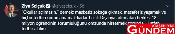 Milli Eğitim Bakanı Ziya Selçuk, sosyal medya hesabı Twitter'dan "tedbir" uyarısında bulundu. Bakan Selçuk, “Okullar açılmasın.” demek; maskesiz sokağa çıkmak, mesafesiz yaşamak ve hiçbir tedbiri umursamamak kadar basit. Dışarıya adım atan herkes, 18 milyon öğrencinin sorumluluğunu omzunda hissetmek zorunda… Lütfen, tedbir alalım.” paylaşımını yaptı.