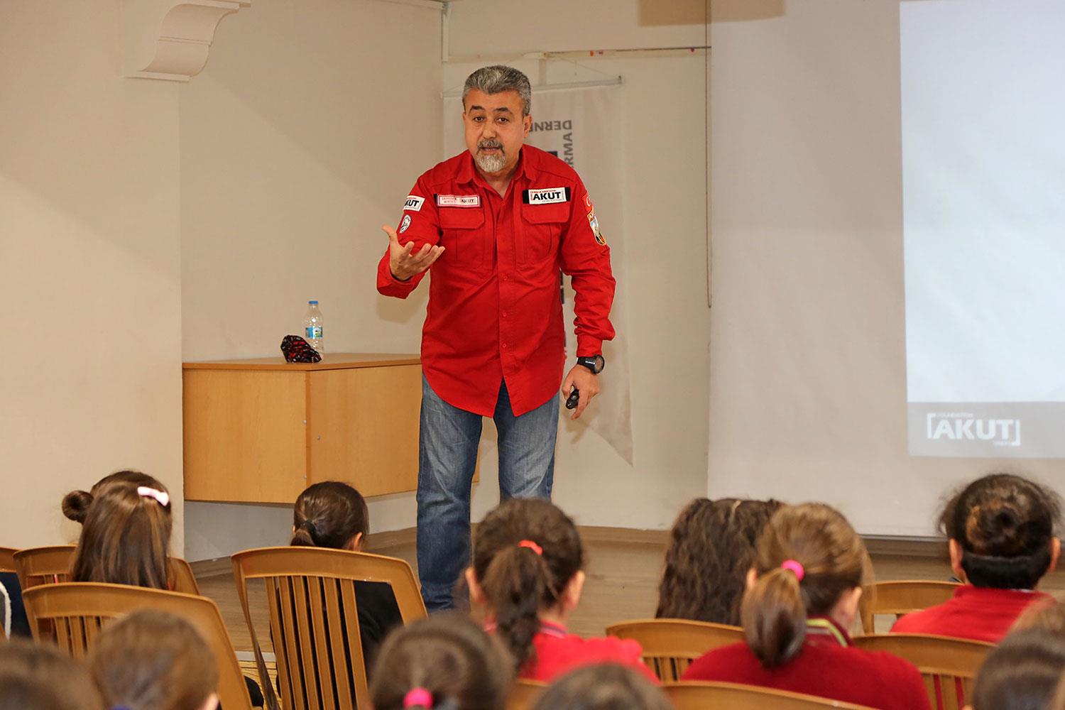 AKUT eğitmenleri Bülent İşler ve Ertuğ Karaduman tarafından sunulan seminerlerde deprem öncesi, deprem esnası ve deprem sonrasında neler yapılması gerektiği anlatılıyor. Seminerlerde öğrencilerden gelen sorular da cevaplandırılıyor.