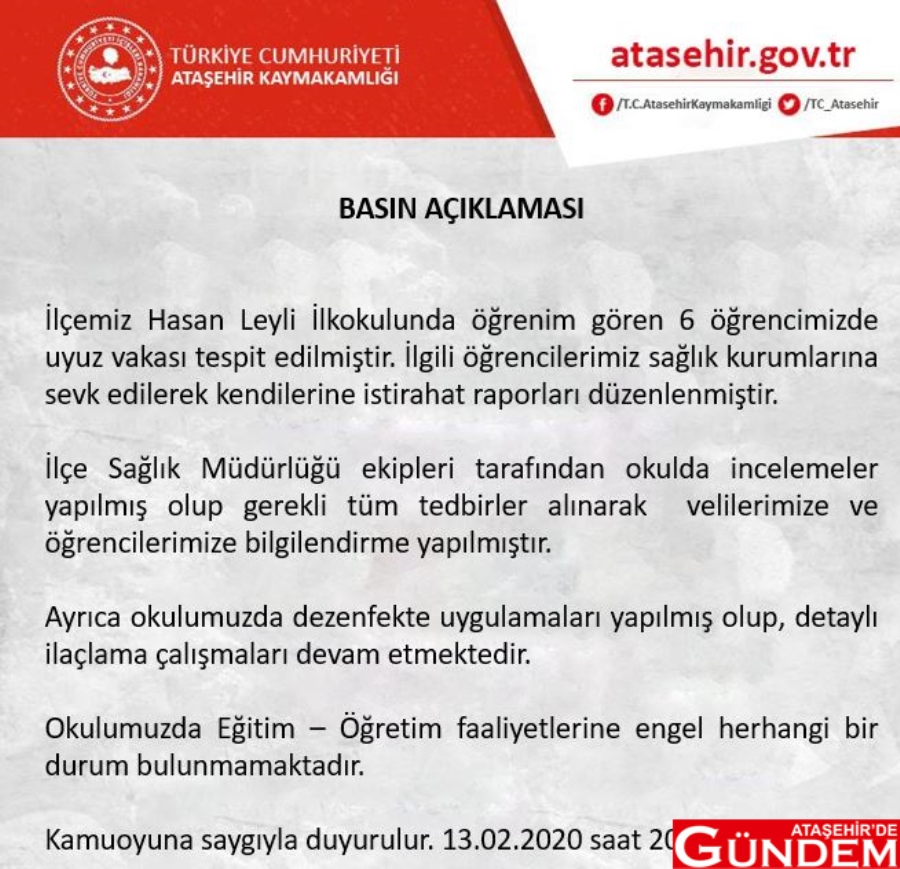 Ataşehir İçerenköy Mahallesi'nde bulunan Hasan Leyli İlkokulu’nda yaşanan uyuz vakasını haber yapmamızın ardından, Ataşehir İlçe Kaymakamlığı kamuoyuna açıklama yaptı.