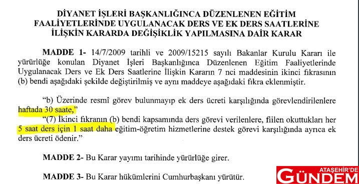 AKP Genel Başkanı ve Cumhurbaşkanı Erdoğan, Diyanet İşleri Başkanlığınca düzenlenen eğitim faaliyetlerinde uygulanacak ders ve ek ders saatlerinin hesaplanmasına ilişkin kararda değişiklik yaptı.