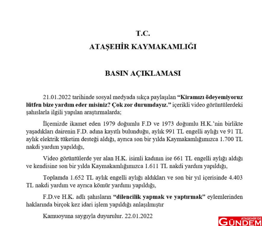 Ataşehir Kaymakamlığı resmi twitter hesabından engelli iki vatandaşın yine sosyal medyadan “Kiramızı ödeyemiyoruz lütfen yardım eder misiniz?” içerikli videosu için açıklama yaptı. Yapılan açıklamada engelli maaşı alarak geçinmeye çalışan F.D.’nin 991 TL. ve H.K.’nın ise 1.652 TL. aylık gelirlerinin olduğu, aynı zamanda H.D.’nin yıllık toplam 4 bin 403 TL. F.D.’nin ise 1.700 TL. nakdi yardım aldıkları belirtildi. Yardım isteyen iki engelli şahsın aynı zamanda “dilencilik yapmak ve yaptırmak” eylemlerinden haklarında birçok kez idari işlem yapıldığı da açıklamada ifade edildi.