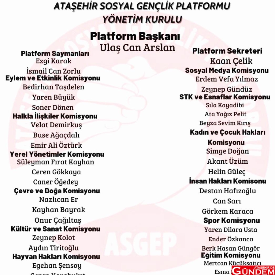 Ataşehir Sosyal Gençlik Platformu (ASGEP), yönetim kadrosunda değişikliğe gitti. Ulaş Can Arslan’ın başkanlığının devam ettiği platform “Dayanışma Güç Toplayacak” ilkesiyle kısa sürede ses getiren çalışmalarına yenilenen kadrosuyla devam ediyor.