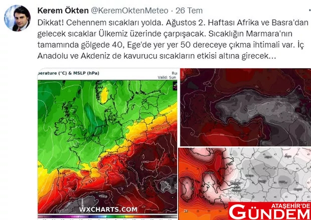 Meteoroloji uzmanı Kerem Ökten de sıcaklıklara karşı uyarılarda bulundu. Sosyal medyada yaptığı hava durumu paylaşımlarıyla bilinen Ökten, ağustosun ikinci haftası için korkutan uyarıda bulundu. "Cehennem sıcakları" geldiğini belirten Ökten'in 26 Temmuz'da yaptığı paylaşım şöyle: