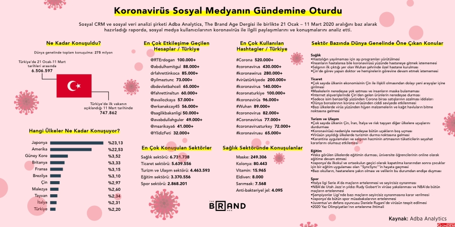 Sosyal CRM ve sosyal veri analizi şirketi Adba Analytics, The Brand Age Dergisi ile birlikte 21 Ocak – 11 Mart 2020 aralığını baz alarak hazırladığı raporda, sosyal medya kullanıcılarının koronavirüs ile ilgili paylaşımlarını ve konuşmalarını analiz etti.