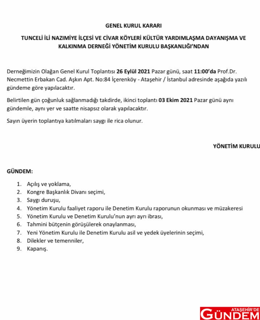 TUNCELİ NAZİMİYE GENEL KURUL İLANI