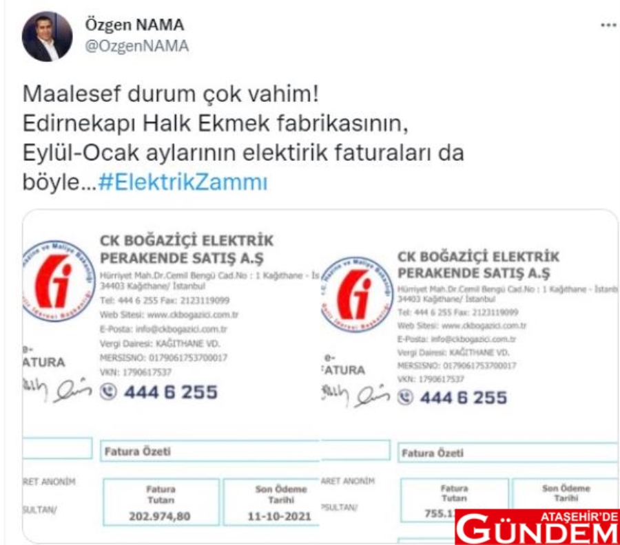 Halk Ekmek A.Ş Yönetimi Kurulu Başkanı Vekili Özgen Nama sosyal medya hebasından "Maalesef durum çok vahim! Edirnekapı Halk Ekmek fabrikasının, Eylül-Ocak aylarının elektrik faturaları da böyle…" diyerek tepkisini gösterdi.
