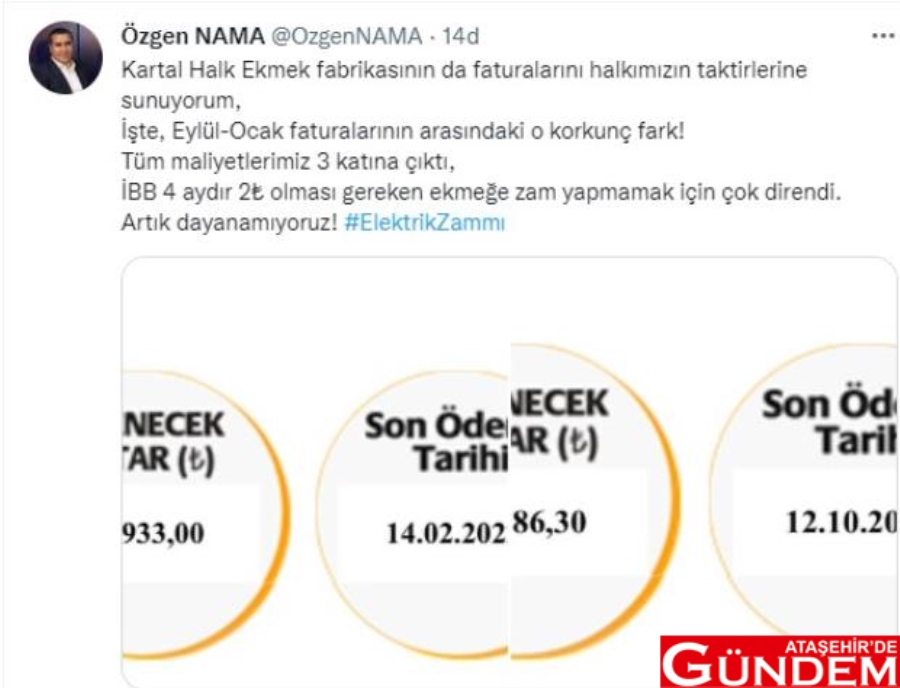 Özgen Nama Kartal Halk Ekmek Fabrikası'nın faturasını da sosyal medya hesabından paylaşarak, "Kartal Halk Ekmek fabrikasının da faturalarını halkımızın taktirlerine sunuyorum, İşte, Eylül-Ocak faturalarının arasındaki o korkunç fark! Tüm maliyetlerimiz 3 katına çıktı, İBB 4 aydır 2? olması gereken ekmeğe zam yapmamak için çok direndi. Artık dayanamıyoruz! #ElektrikZammı" dedi.