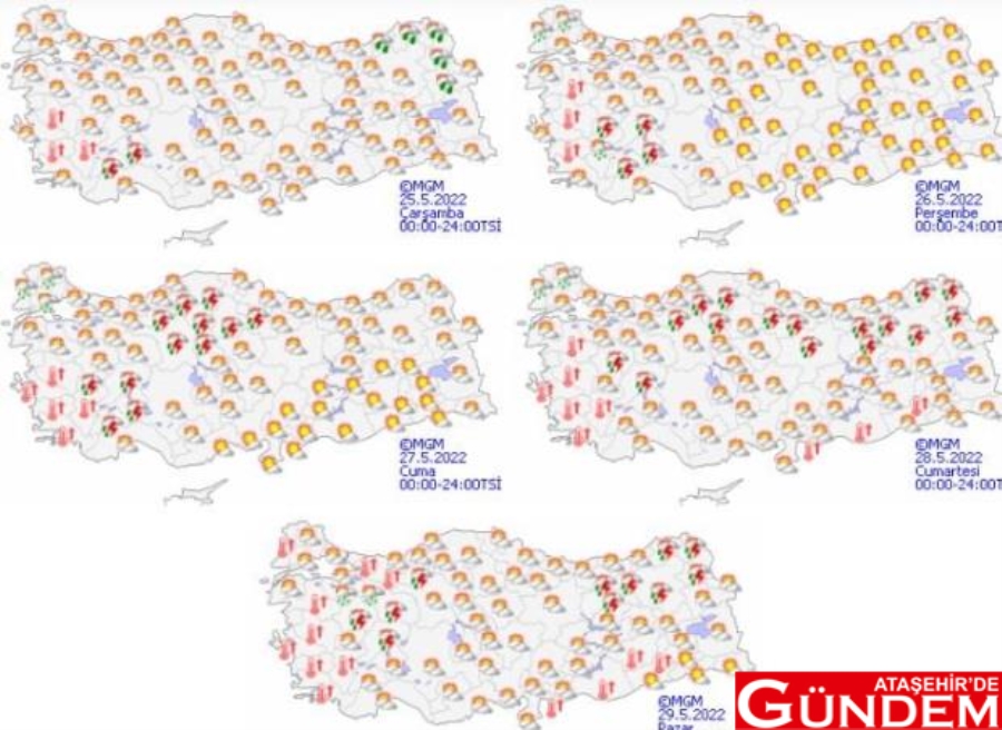 Meteoroloji Genel Müdürlüğü tarafından yapılan son değerlendirmelere göre: Ülkemiz genelinin parçalı, yer yer çok bulutlu, Akdeniz'in iç kesimleri ve Doğu Karadeniz'in iç kesimlerinin, Rize, Kars, Ardahan ve Ağrı illeri ile Kütahya'nın doğu, Afyon'un kuzey ve batı çevrelerinin yerel sağanak ve gök gürültülü sağanak yağışlı geçeceği tahmin ediliyor. Doğu Anadolu'nun güneydoğusunda toz taşınımı bekleniyor.son dakika.com