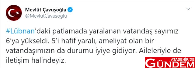 Dışişleri Bakanı Mevlüt Çavuşoğlu, Lübnan'ın başkenti Beyrut'ta meydana gelen patlamada yaralanan Türk vatandaşı sayısının 6'ya yükseldiğini açıkladı. Çavuşoğlu’nun konuyla ilgili paylaşımı şöyle: