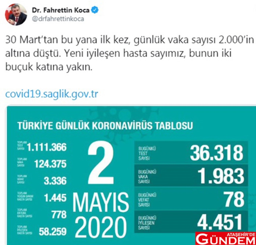 Koca'nın Twitter hesabından paylaştığı tabloya göre; bugün 36 bin 318 test yapıldı, 1983 yeni vaka tanısı konuldu. 78 kişi vefat etti ve 4 bin 451 kişi de iyileşerek taburcu oldu. Tabloda toplam test sayısı 1 milyon 111 bin 366, toplam vaka sayısı 124 bin 375, toplam vefat sayısı 3 bin 336, toplam yoğun bakım hasta sayısı 1445, toplam entübe hasta sayısı 778, toplam iyileşen hasta sayısı ise 58 bin 259 olarak açıklandı.