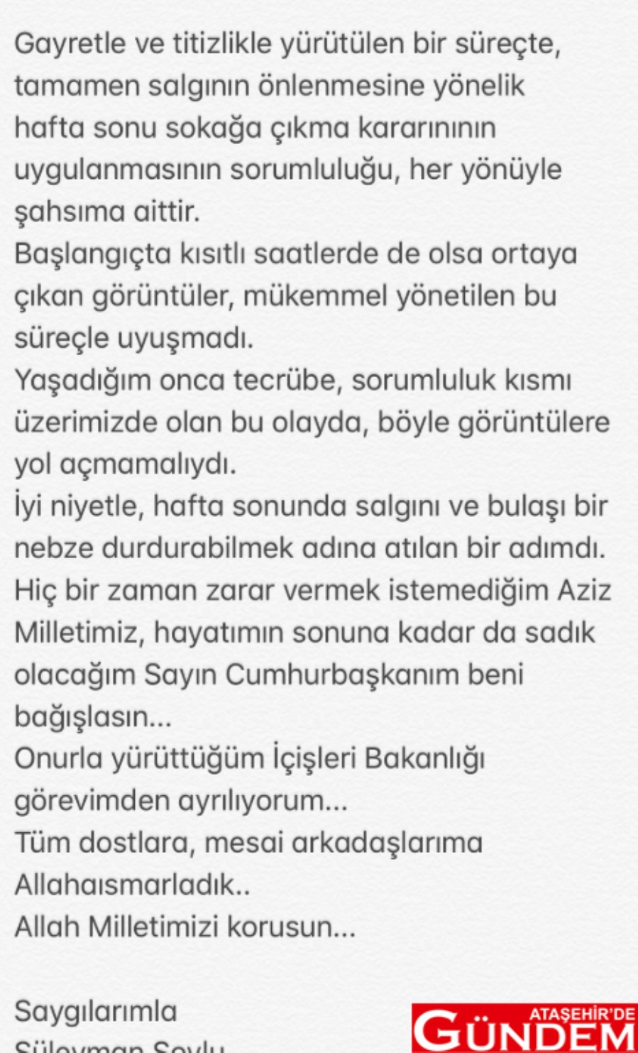 Soylu mesajında "Gayretle ve titizlikle yürütülen bir süreçte tamamen salgının önlenmesine yönelik hafta sonu sokağa çıkma kararının uygulanmasının sorumluluğu, her yönüyle şahsıma aittir, İçişleri Bakanlığı görevimden ayrılıyorum" ifadelerini kullandı.
