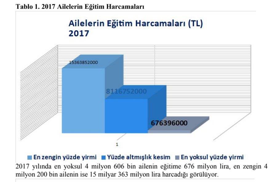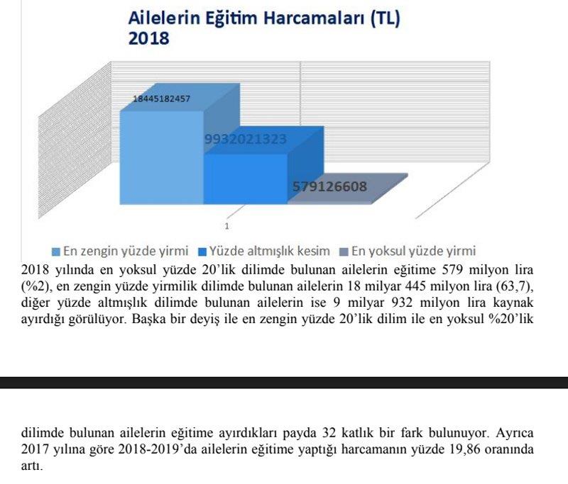 *En zengin yüzde 20'lik dilim ile en yoksul yüzde 20'lik dilimde bulunan ailelerin eğitime ayırdıkları pay 2017 yılında 23 katlık bir fark bulunurken, 2018 yılında bu fark 32 kat oldu.