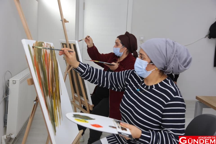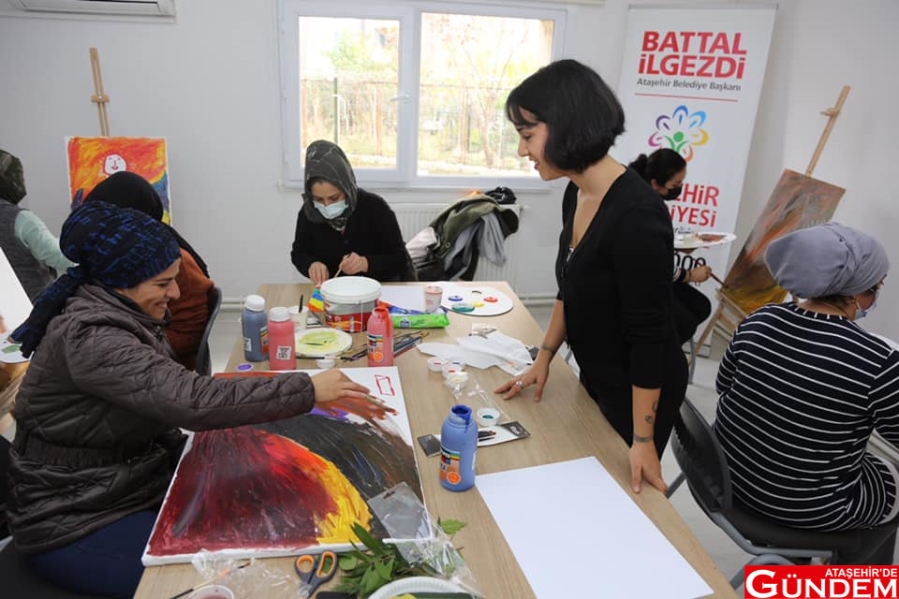 Şiddete uğrayan kadınlara, ihtiyaç duyabilecekleri psikolojik ve hukuksal hizmetleri sunan aynı zamanda sosyal ve ekonomik olarak kadınların güçlenmeleri için politikalar üreten Ataşehir Kadın Dayanışma Merkezi’nde her kadın bir tuvalle buluştu. Konusunda uzman kişiler tarafından yürütülen çalışmalarda kadınların yaşam konforunu artırmaya yönelik çalışmalara renkler de eklenerek kadınların hayallerini resme dökmeleri sağlandı.