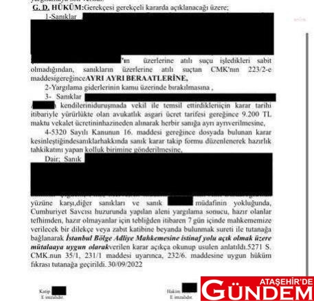 İstanbul’da iptal edilen 31 Mart yerel seçimlerinde Ataşehir’deki sandıklarda görev yapan 17 kişi hakkında ‘görevi kötüye kullandıkları’ iddiasıyla açılan davada; 40. Asliye Ceza Mahkemesi beraat kararı verdi. CHP İstanbul İl Başkanı Canan Kaftancıoğlu, “O gün bangır bangır konuşan siyasetçiler ve bataklık medyasına gelsin” dedi.