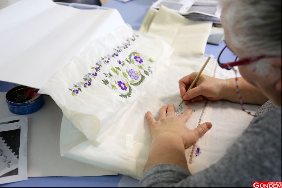 Bu kurslardan biri olan ve son zamanlarda en çok ilgi gören el sanatları arasında yer alan makine nakışı ve iğne oyası Ataevlerinde yetenekli kadınların ellerinde hayat buluyor.