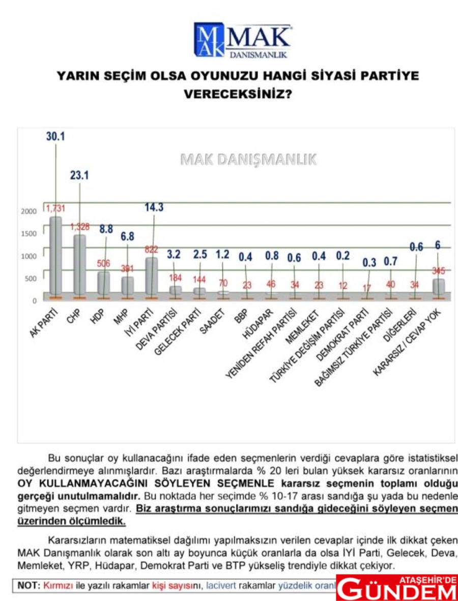 MAK Danışmanlık, 8-17 Ocak tarihleri arasında yaptığı anketin sonuçlarını yayımladı. Ankete göre Cumhur İttifakı, Millet İttifakı'nın gerisine düştü. Katılımcıların yüzde 64'ü ise parlamenter sisteme dönülmesi gerektiğini, yüzde 46'sı ise parti değiştireceğini söyledi.