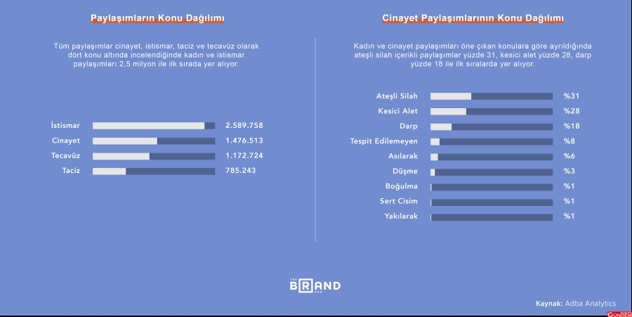 Kadın ve cinayet paylaşımları öne çıkan konulara göre ayrıldığında ateşli silah içerikli paylaşımlar yüzde 31, kesici alet yüzde 28, darp yüzde 18 ile ilk sıralarda yer alıyor.