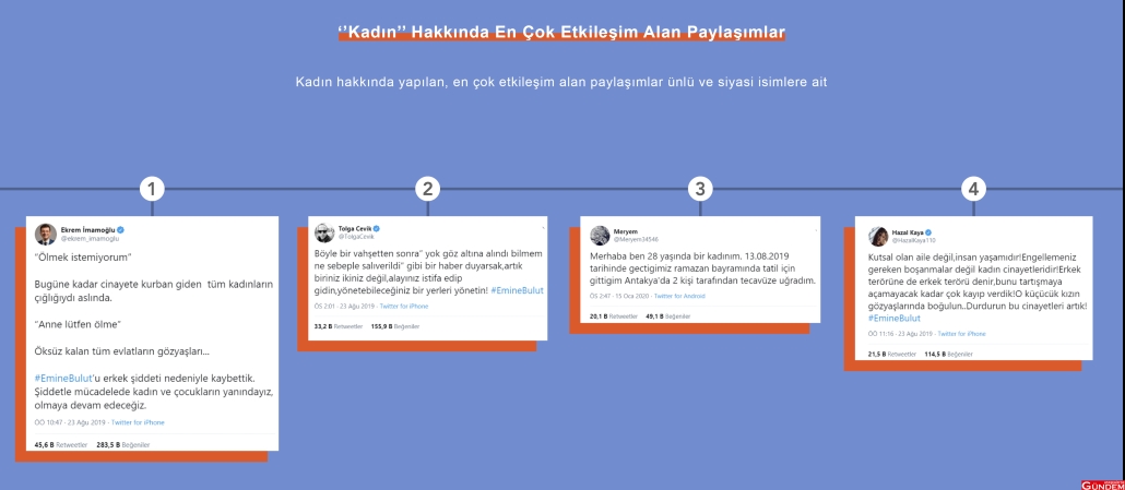 Raporda 2019 Ocak ayından itibaren ‘’kadın’’ ile ilgili yapılan paylaşımların tamamının yaklaşık 23 milyon adet olduğunu görülüyor. Sosyal medyada ‘’kadın’’ kelimesini içeren günlük ortalama 55 bin adet paylaşım yapılırken, zamansal dağılımda mart ve kasım ayında konuşulma oranında artış yaşanması dikkat çekiyor. Bu aylarda yapılan paylaşımların içeriğine bakıldığında; mart ayında Dünya Kadınlar Günü’nün, ağustos ayında Emine Bulut cinayetinin, aralık ayında ise Dünya Kadın Hakları Günü’nün yapılan paylaşımların hacmini artırdığı görülüyor.