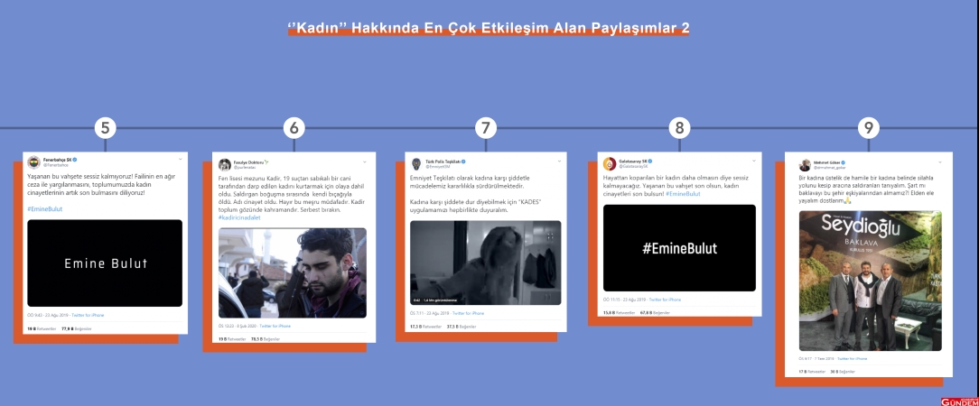 ‘’Kadın’’ ile ilgili kullanılan hashtagler incelendiğinde listede yer alan hashtaglerin neredeyse tamamının kadın cinayeti ile ilişkili konular olması dikkat çekiyor. 2018 yılında #8MartDünyaKadınlarGünü etiketi 420 bin kere kullanılarak ilk sırada yer alırken, bu yıl #EmineBulut cinayeti en çok konuşulan konu başlığı oluyor. Emine Bulut cinayetini 94 bin paylaşım ile #kadiricinadalet, 78 bin paylaşım ile #CerenÖzdemir, 54 bin paylaşım ile #ŞuleÇetİçinAdalet takip ediyor.