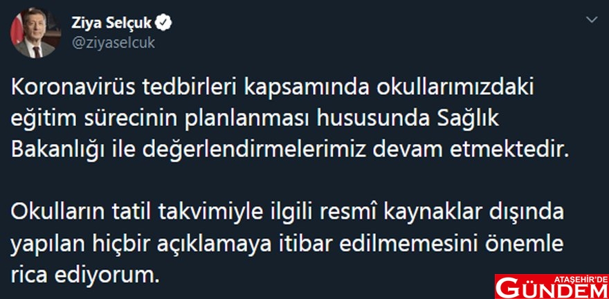 Milli Eğitim bakanı Ziya Selçuk’un sosyal medyadan yaptığı paylaşım şöyle:“Korona virüs tedbirleri kapsamında okullarımızdaki eğitim sürecinin planlanması hususunda Sağlık Bakanlığı ile değerlendirmelerimiz devam etmektedir. Okulların tatil takvimiyle ilgili resmî kaynaklar dışında yapılan hiçbir açıklamaya itibar edilmemesini önemle rica ediyorum.