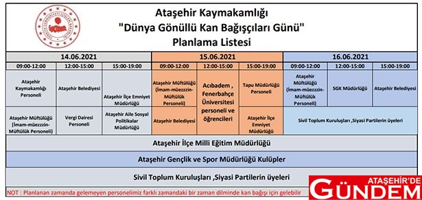 Dünya Gönüllü Kan Bağışçıları Günü kapsamında İstanbul Valiliği ve Türk Kızılayı işbirliğiyle 14-15-16 Haziran 2021 Pazartesi günü tüm İstanbul ile birlikte Ataşehir’de Kaymakamlık tarafından kan bağışı kampanyası düzenlenecek. Etkinliğe kamu kurumları ve STK’lar da katılacak.