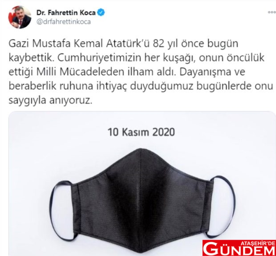 Sağlık Bakanı Fahrettin Koca'nın Türkiye Cumhuriyeti'nin kurucusu Mustafa Kemal Atatürk'ün ölüm yıldönümü nedeniyle yayımladığı mesajda siyah maske görseli kullanması eleştirilere neden oldu.