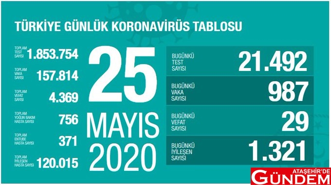 Ramazan Bayramı’nın ikinci gününde Türkiye günlük koronavirüs tablosu Sağlık Bakanı Fahrettin Koca tarafından açıklandı. Bakan Koca göre son 24 saatte koronavirüsten dolayı hayatını kaybedenlerin sayısını 29, yeni vaka sayısını ise 987 olarak açıkladı.