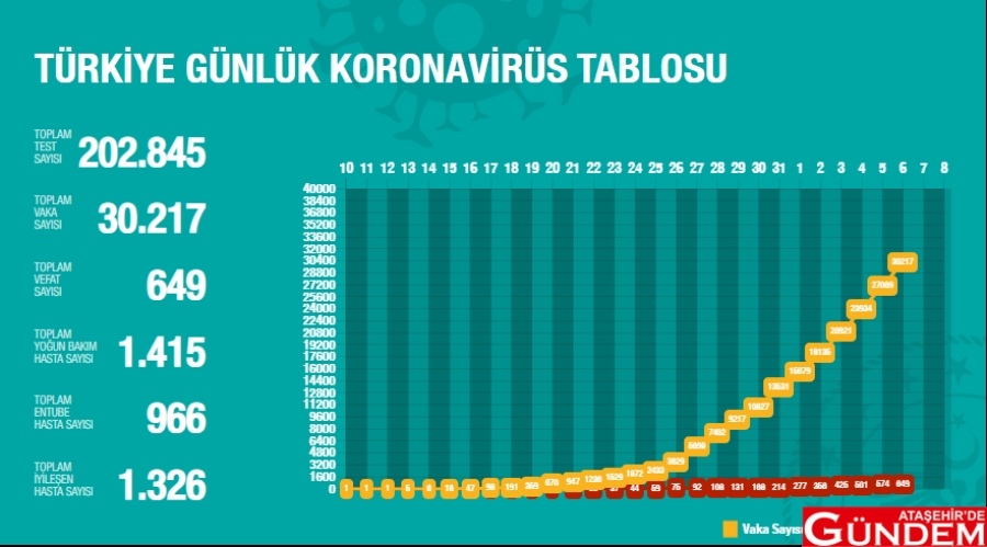 Tabloya göre bugün yapılan 21 bin 400 koronovirüs testinden 3 bin 148'i pozitif çıktı, 75 kişi hayatını kaybetti, 284 hasta da iyileşti. Tabloda toplam test sayısı 202 bin 845, toplam vaka sayısı 30 bin 217, toplam vefat sayısı 649, toplam yoğun bakım hasta sayısı bin 415, toplam entübe hasta sayısı 966, toplam iyileşen hasta sayısı bin 326 olarak yer aldı.