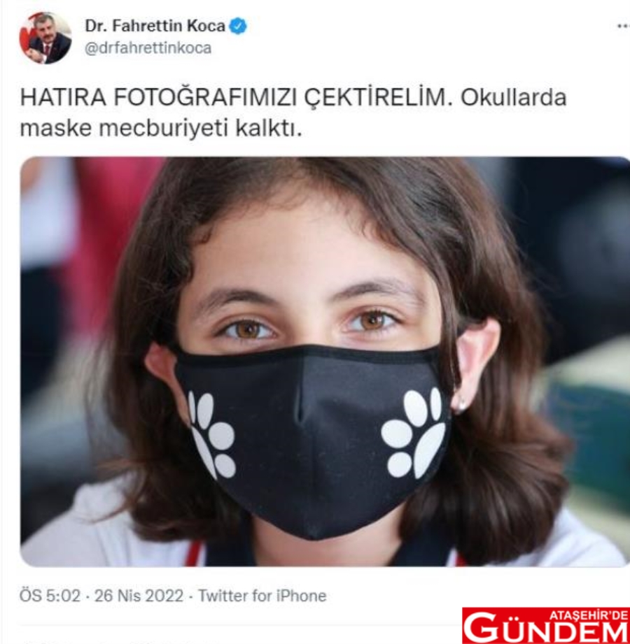 Açıklamasının ardından bir paylaşımda daha bulunan Bakan Koca, "Hatıra fotoğrafımızı çektirelim. Okullarda maske mecburiyeti kalktı" dedi.