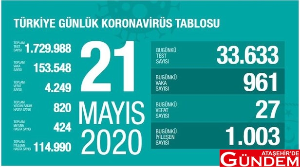 Sağlık Bakanı Fahrettin Koca, 21 Mayıs tarihi için koronavirüse dair son rakamları resmi internet sitesinde yayımladı.Türkiye'de son 24 saatte 961 kişiye yeni tip koronavirüs tanısı konuldu ve 27 kişinin de hayatını kaybettiği açıklandı.