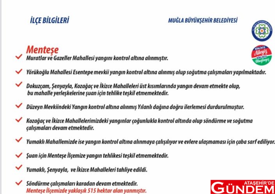 Türkiye’nin ciğerleri günlerdir yanıyor. Ege ve Akdeniz Bölgeleri’nde yaşanan orman yangını için Muğla Büyükşehir Belediyesi bölgesinde inceleme başlatıp yangın raporu hazırladı. Raporda soğutma çalışmalarının devam ettiği bölgeler ile yanan alanların tespiti listelendi. Öte yandan raporda yangın söndürmeden görev alan personel sayısına, yurt dışından gelen yardımlardan, yangın bölgesinde görevli araçlara ve yetkililer tarafından tehlikeli görülen bölgeler için tahliyelerin gerçekleştirildiği ilçeler de yer alıyor.