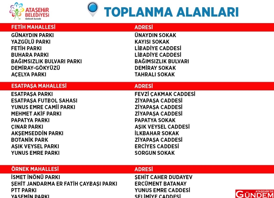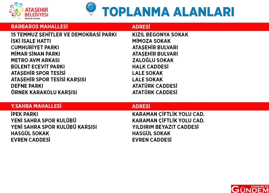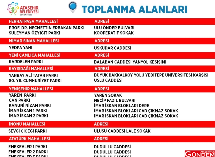Ataşehir’de AFAD tarafından belirlenen 93 toplanma alanı bulunuyor. Ataşehir’deki size en yakın toplanma alanını, web sayfamızdaki Afet Bilgi Sistemi’nden öğrenebilirsiniz.