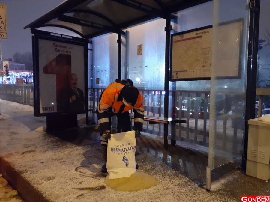 İstanbul genelinde 60 noktada kurulan BEUS’tan (Buzlanma Erken Uyarı Sistemi) gelen mesajlar doğrultusunda ekipler çalışmalarını yürütüyor. Ekiplerin takibi ve yönlendirilmesi araç takip sistemi üzerinden sağlanıyor. Kritik noktalara kutu tuzlar bırakıldı. Gelen veriler ışığında üstgeçitler, otobüs durakları, meydanlar, gibi kritik noktalarda da kar birikintilerine ve buzlanmalara ekipler tarafından müdahale edilecek. İBB Yol bakım ekibi şu zamana kadar 9 bin 53 ton tuz, 4 ton da solüsyon döktü.