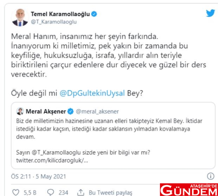 Karamollaoğlu da bu paylaşımı alıntılayarak, "Meral Hanım, insanımız her şeyin farkında. İnanıyorum ki milletimiz, pek yakın bir zamanda bu keyfiliğe, hukuksuzluğa, israfa, yıllardır alın teriyle biriktirileni çarçur edenlere dur diyecek ve güzel bir ders verecektir. Öyle değil mi?" diyerek Demokrat Partisi Genel Başkanı Gültekin Uysal'ı etiketledi.
