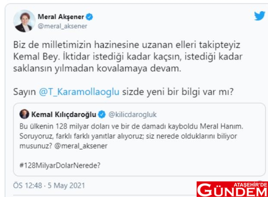 Muhalefetin, "128 milyar dolar nerede?" paylaşımları sosyal medyayı sallamaya devam ediyor. CHP Genel Başkanı Kemal Kılıçdaroğlu'nun, kendisini etiketleyerek yönelttiği "128 milyar dolar nerede?" sorusuna, "Yılmadan kovalayacağız" yanıtını veren İYİ Parti Genel Başkanı Meral Akşener de soruyu Saadet Partisi Genel Başkanı Temel Karamollaoğlu'na iletti. Siyasi liderlerin etkileşimli paylaşımları sosyal medyada yankı uyandırdı.