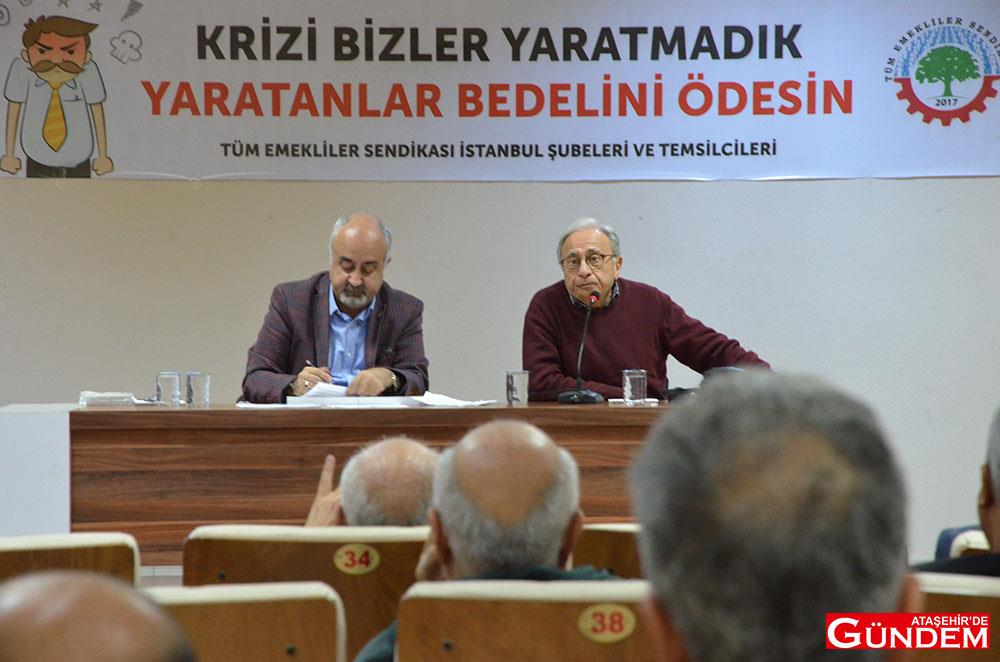 Tüm Emekliler Sendikası tarafından düzenlenen 'Ekonomik Kriz ve Emekliler' başlıklı panel, konuşmacı Prof. Dr. İzzettin Önder'in katılımıyla Ataşehir, İçerenköy Mahallesi'ndeki Pir Sultan Abdal Kültür ve Cemevi Konferansı Salonu'nda gerçekleştirildi. Ataşehir ve Ümraniye şubesi birlikteliğinde 15:00'da düzenlenen panelin moderatörlüğünü Ataşehir Şube Sekreteri Çetin Düzce üstlendi.