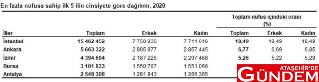 İstanbul'un nüfusu, bir önceki yıla göre 56 bin 815 kişi azalarak 15 milyon 462 bin 452 kişiye düştü. Türkiye nüfusunun %18,49'unun ikamet ettiği İstanbul'u, 5 milyon 663 bin 322 kişi ile Ankara, 4 milyon 394 bin 694 kişi ile İzmir, 3 milyon 101 bin 833 kişi ile Bursa ve 2 milyon 548 bin 308 kişi ile Antalya izledi.