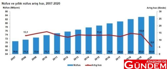 Yıllık nüfus artış hızı 2019 yılında binde 13,9 iken 2020 yılında binde 5,5 oldu.